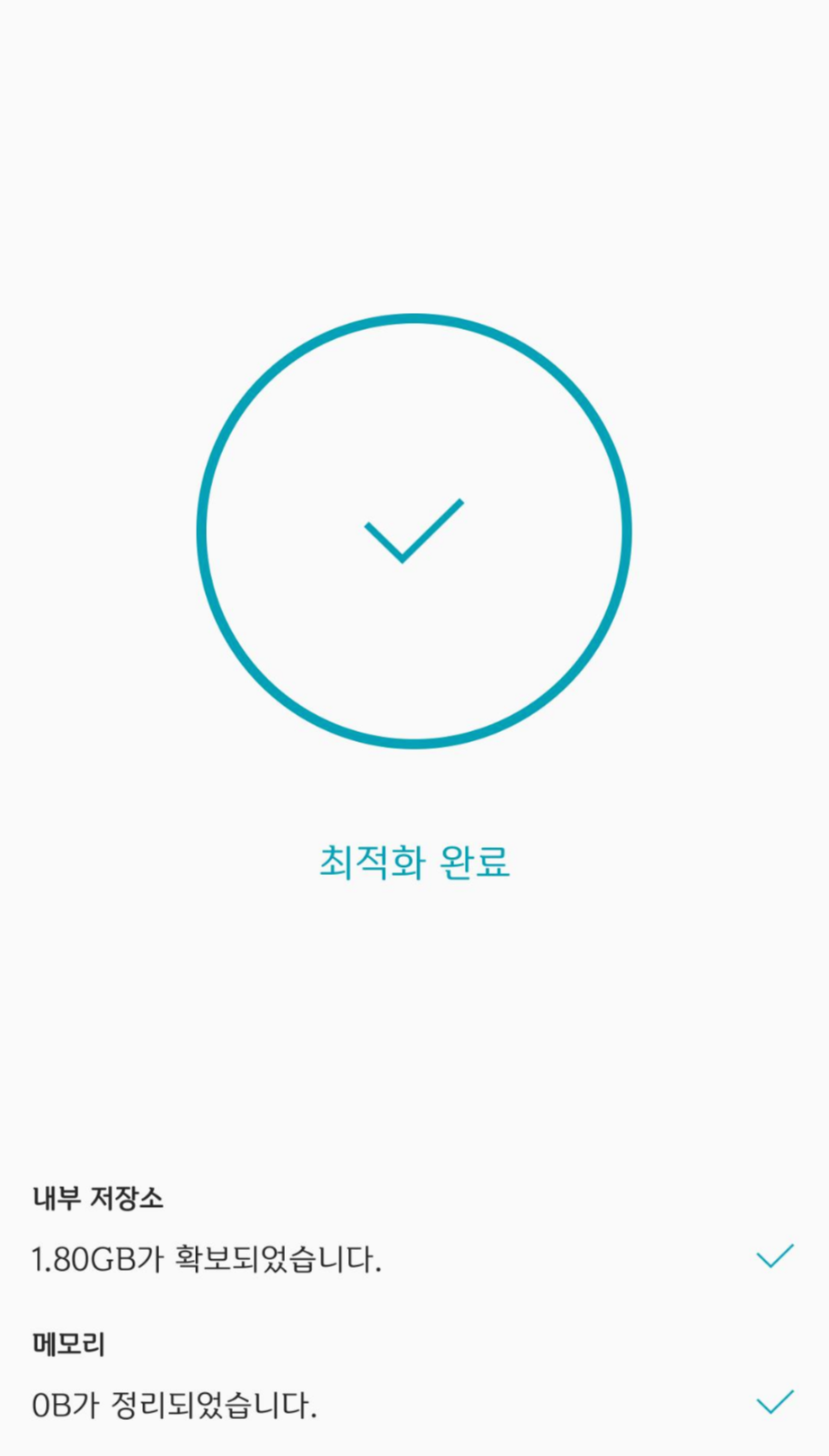 스마트 닥터가 실행되면 아래에 휴대폰 최적화 버튼을 눌러주세요. 그러면 이렇게 메모리 정리를 합니다. 메모리와 저장공간도 함께 정리가 되네요. 메모리가 0B정리된 건 제가 휴대폰을 재시작하자마자 메모리 정리를 해서 그렇습니다. 저장용량이 1.8기가나 늘었네요.