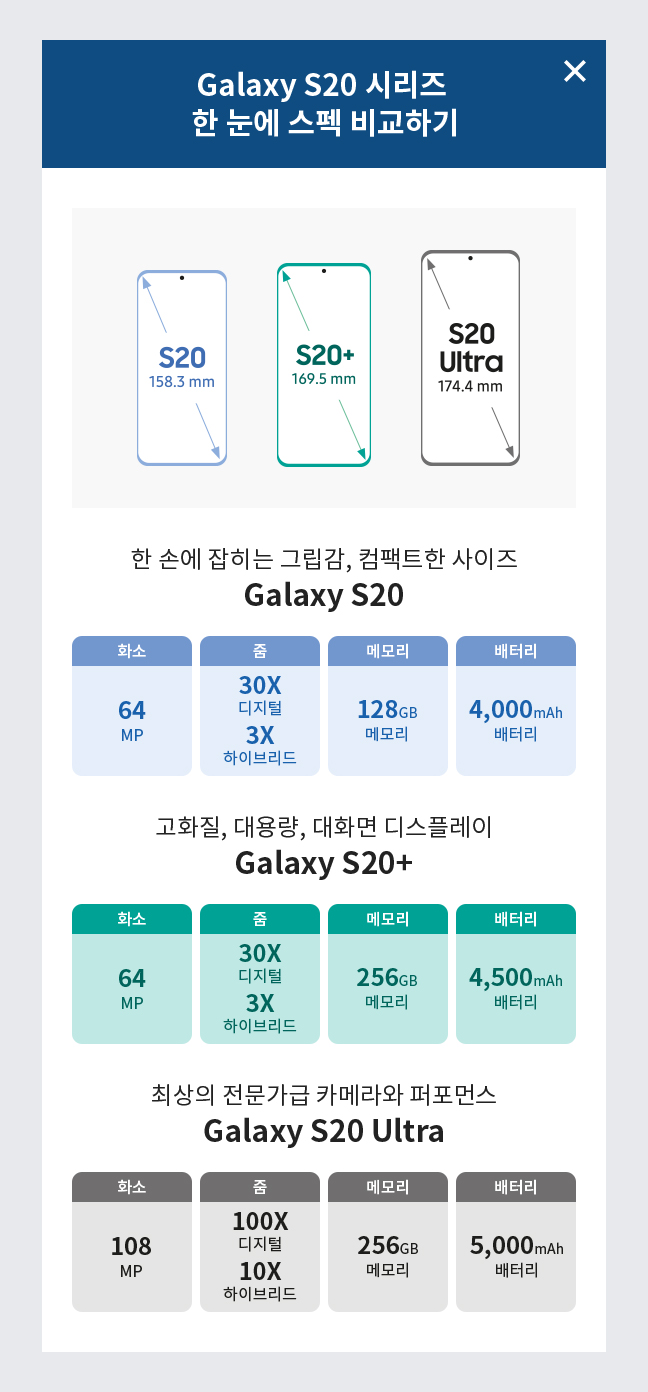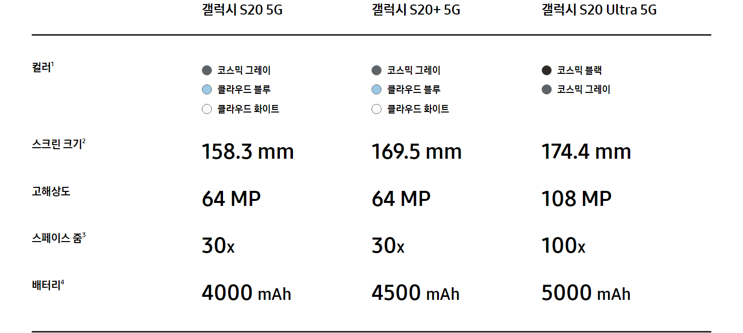 모든 순서는 S20/S20+/S20울트라 순입니다.