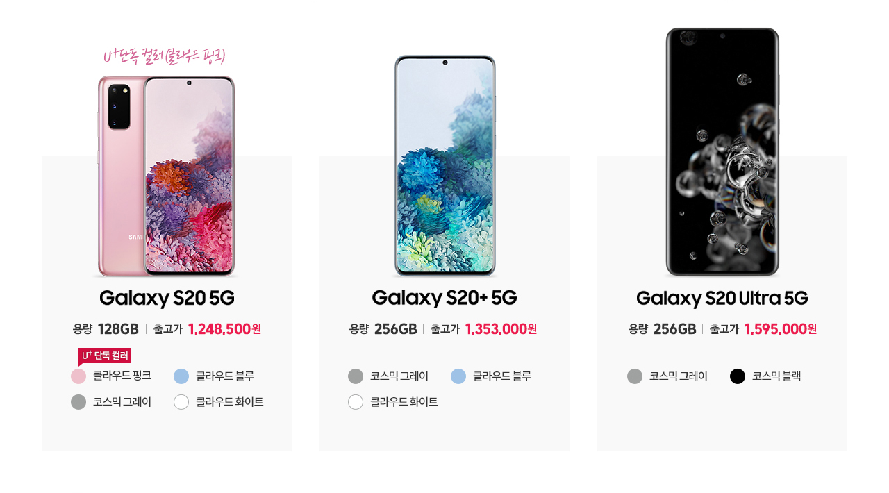S20, S20+는 클라우드 블루/클라우드 화이트/코스믹 그레이 3가지 색상이며