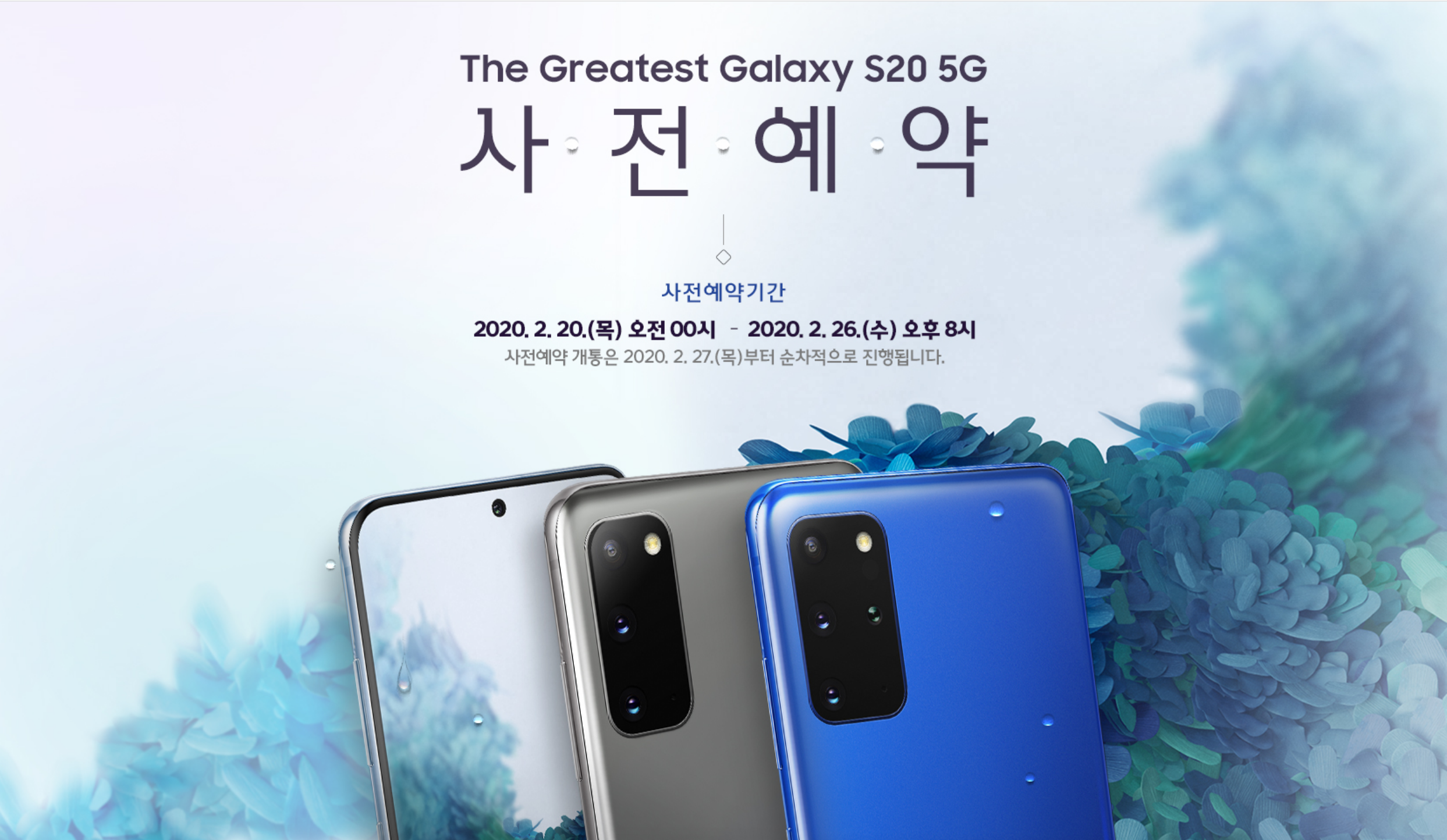 갤럭시 S20 사전예약은 20년 2월 20일(목)부터 26일(수)까지 일주일 간입니다.