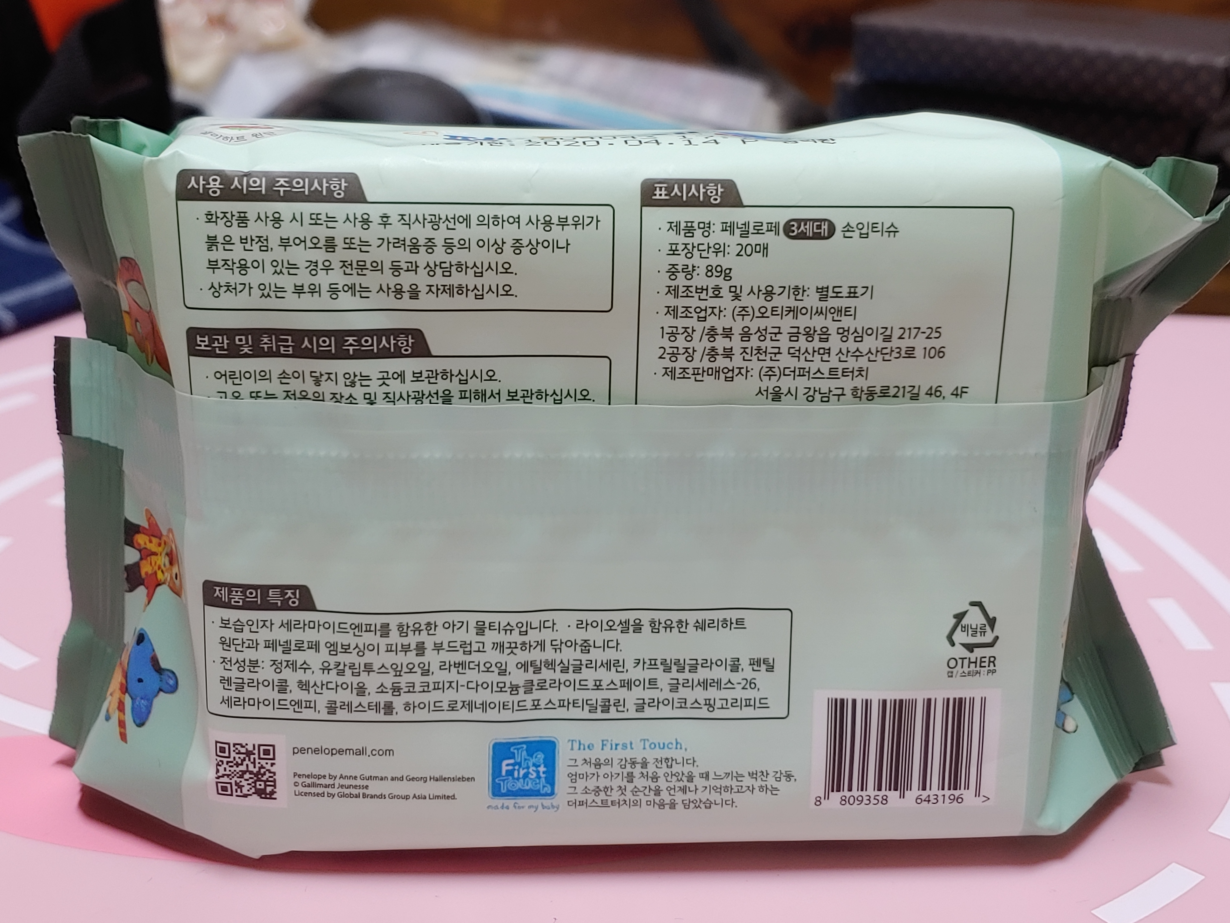 휴대용 물티슈 역시 페넬로페 손과입티슈를 사용하고 있습니다.